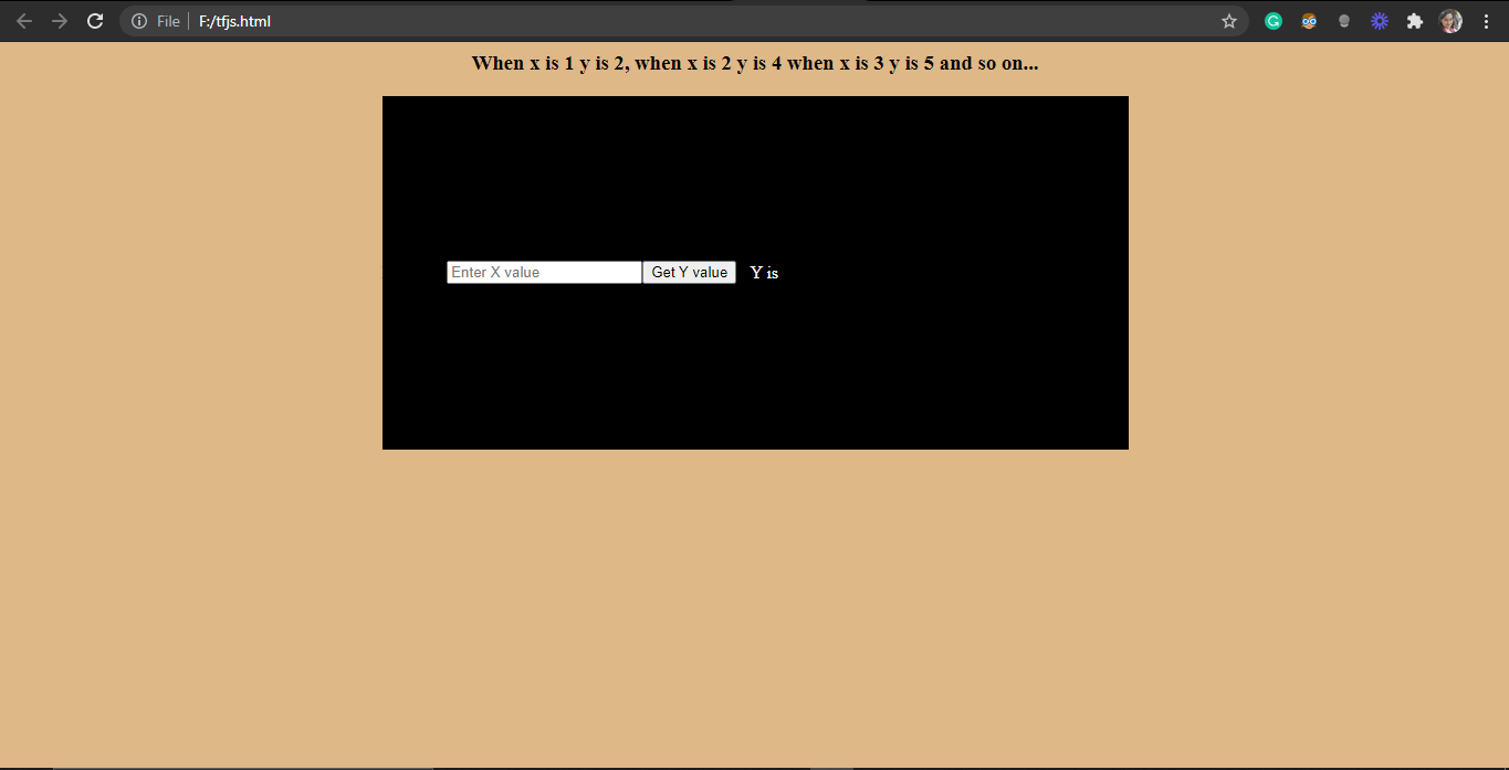 document.getElementById('output').innerText = model.predict(tf.tensor2d([x_val], [1, 1]));